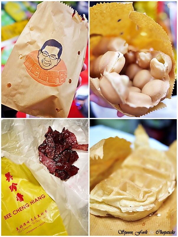 | Egg waffles (top 2), bak kwa (bottom left), HK-style waffle (bottom right) |